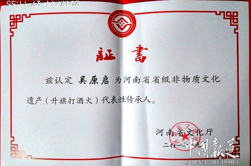 中国报道讯(记者吴蜀丰)日前,吴原启被河南省文化厅认定为河南省省级非物质文化遗产(升起打酒火)代表性传承人。吴原启,祖籍河南省平舆县,自幼受父亲传诵演绎“升起打酒火”的影响而产生浓厚兴趣,在耳濡目染中随声附和,逐步进入角色。因祖上船民大都没有文化,民俗“升起打酒火”大多是口传心授,所以难免遗漏和谬传。吴原启坚持收集整理相关资料二十几年,并协助县文化馆对该项目仪式进行反复考证,并整理编撰成册,使这一濒临失传的非物质文化遗产得以延续。2010年,“升起打酒火”列入河南省第二批非物质文化遗产保护名录。同年,吴原启被认定为驻马店市市级非物质文化遗产(升起打酒火)代表性传承人。2013年,“升起打酒火”入编驻马店政协文史资料第十辑《天中记忆•文化卷》。