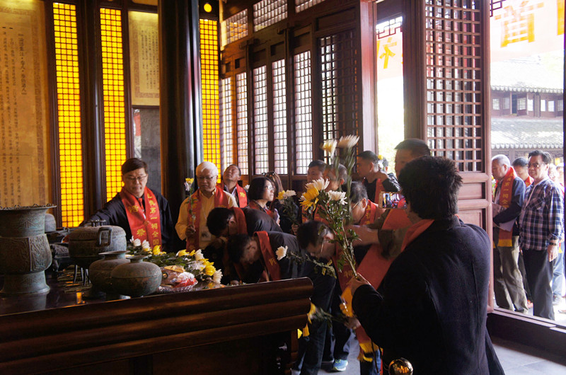 发起人读毕祭文,大家依序起入至德殿,深深躹躬,献上或洁白或金黄的枝枝菊花,表达对始祖的追怀和敬仰。