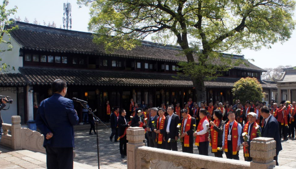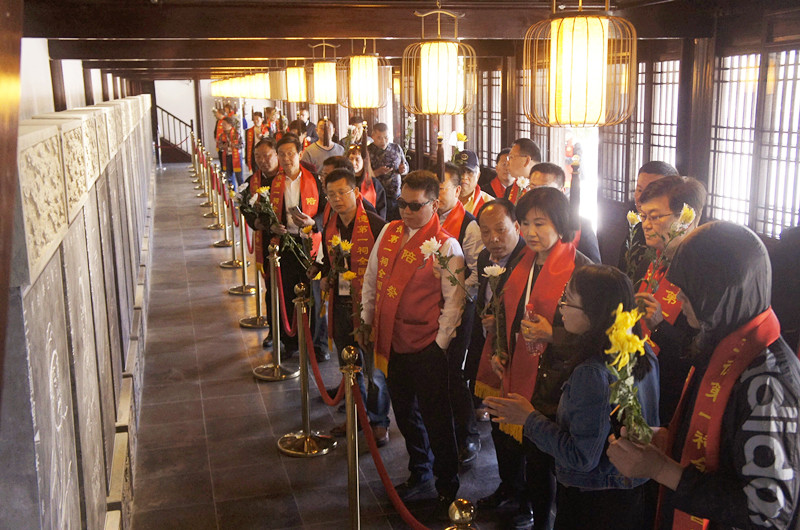 芳菲四月天,春色满桃坞。这天,在苏州新世纪大酒店刚参加完“首届新时代泰伯文化经济发展高峰论坛”的全国泰伯文化合法社会组织和相关企业、机构百余嘉宾和泰伯后裔代表,步行1.6公里向泰伯庙进发。沿途,他们观赏了姑苏老城区的石路步行街、山塘古街、京杭大运河、阊门等,在西中市附近街头瞻仰了泰伯雕像。约20分钟,大家到达泰伯庙。