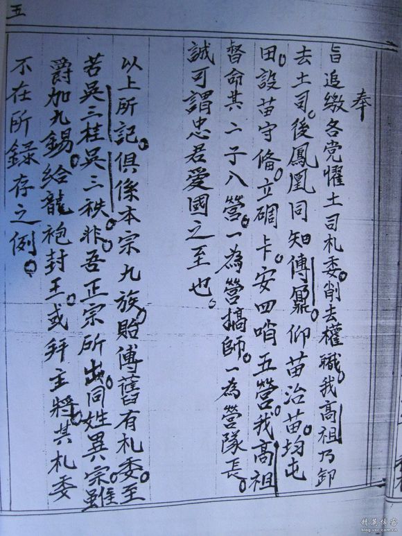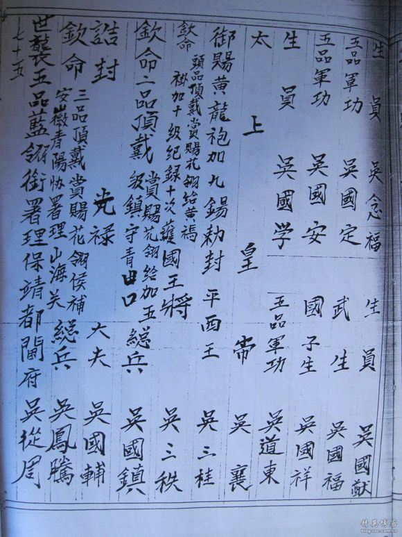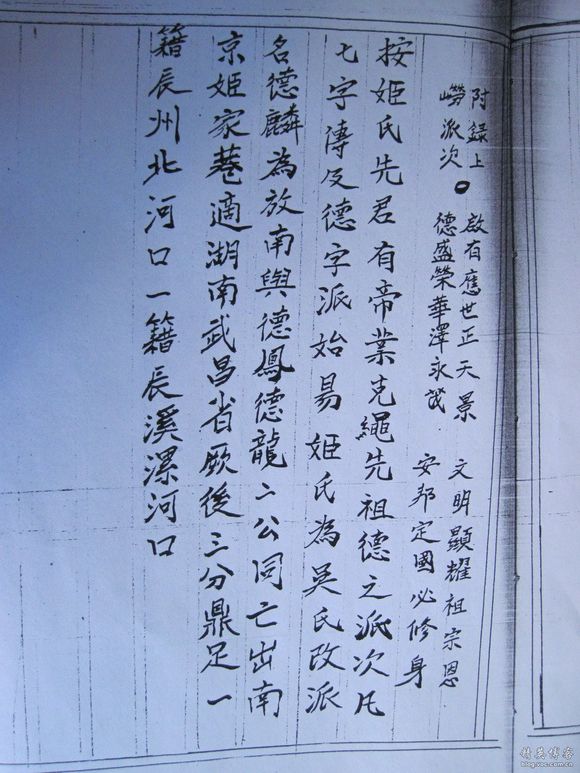 吴鹤是苗族明代教育家、诗人,谱中分“姬氏漂流考”、“鲁宗国考”、“隐姓氏考”、“溪头上崂割分疆域”、“大房同宗”、“历代吴姓文武军功出身录”、“功牌杂志录”、“委任”、“诗录”、“历代名员录”、“节孝”、“寿老”等章篇,对研究苗族繁衍及教育文化史有参考价值。此谱共2卷、1册、130页。草纸线装,楷体墨书,页面尺寸为27.3X19.5cm,四周双边,11行18至20字,有页码插图,保存完好,湘西自治州民研所有收藏。