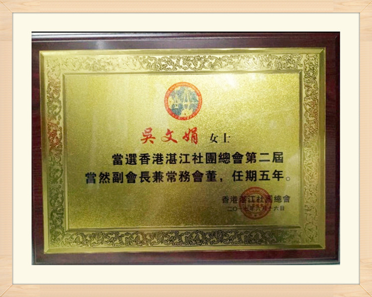 据悉,吴文娟宗亲是湛江市政协委员、徐闻县政协常委、香港青雲迷你倉有限公司董事。现在担任香港徐闻同乡联谊会会长,香港湛江社团总会第二届当然副会长兼常务会董。