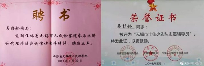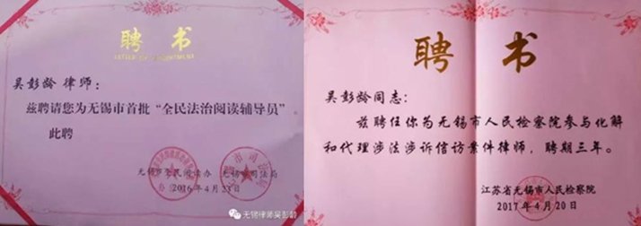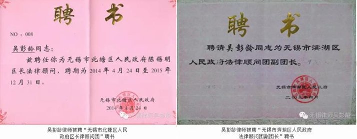 【关于吴彭龄】无锡律师吴彭龄,中共党员,大学本科,中国法学会会员,江苏仁勤律师事务所名誉主任、执业律师,i板和澳洲上市保荐律师。吴彭龄律师1990年通过律师资格考试,1991年取得《中华人民共和国律师资格证》,1992年领取《中华人民共和国律师执业证》,开始律师执业。吴彭龄律师曾任县级政府法制办公室主任、法制事务所主任,应聘担任过多年县级政府法律顾问团副团长、区长法律顾问和武警某师部法律顾问、某实验小学法制副校长,现为无锡市首批全民法治阅读辅导员,无锡市人民检察院参与化解和代理涉法涉诉信访案件律师。吴彭龄律师擅长担任各级政府、政府部门和各类企事业单位的法律顾问,能胜任办理各类公司经营、合同履行、婚姻家庭、工程建筑、债务催讨等民事(经济)案件;受贿、渎职、法人犯罪等刑事案件;拆迁安置、国家赔偿等行政案件;尤其擅长参与各级政府、各类企事业单位的顶端设计、协商调解、尽职调查、谈判见证等非讼业务,可作为各类中小企业i板和澳洲上市保荐律师。