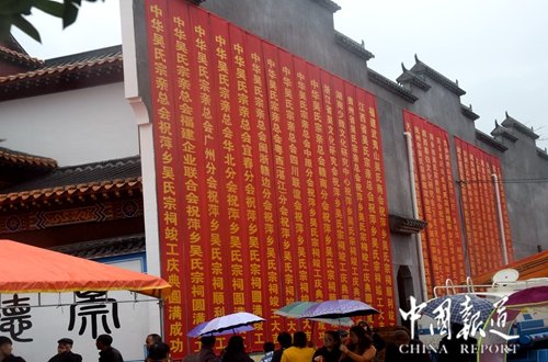 中国报道讯(记者吴蜀丰)今日(2017年11月18日),来自福建、广东、湖南、重庆、四川、贵州、云南、辽宁、江苏、江西等省市及台湾、香港、加拿大等地区近3000余名吴氏宗亲代表相约江西萍乡市芦溪县芦溪镇东阳村共同庆贺吴氏宗词落成典礼。