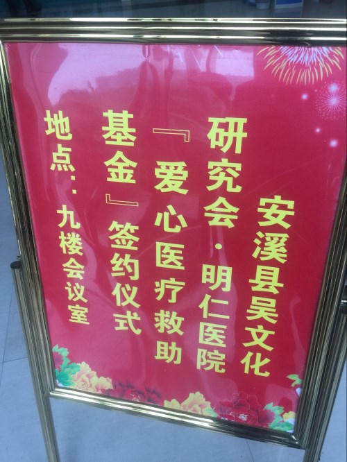 为贯彻十九大“人民对美好生活的向往就是我们的奋斗目标”的精神,增强安溪吴氏宗亲的获得感。2017年11月25日上午九时半,安溪吴文化研究会与安溪明仁医院“爱心医疗救助基金”项目签约仪式在安溪二环路明仁医院九楼会议室隆重举行。