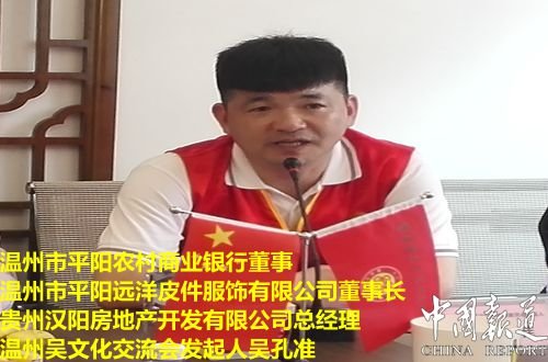 中国报道(记者吴蜀丰)今日下午(5月1日),来自全国各地吴氏宗亲负责人代表参加温州吴氏文化交流会以下简称(温吴会)。温州市平阳农村商业银行董事、温州市平阳远洋皮件服饰有限公司董事长、贵州汉阳房地产开发有限公司总经理、温州吴文化交流会发起人吴孔准在会上发表热情洋溢的欢迎辞。就成立温州吴氏文化交流会倡导谦让和谐创新为宗旨发声,吴孔准强调低做人低调做事,吴孔准说,在温州地区的吴氏宗亲目前有40多万人,宗亲聚力实实在干实事,传承吴氏先祖至德精神,实现合作共赢共创辉煌!