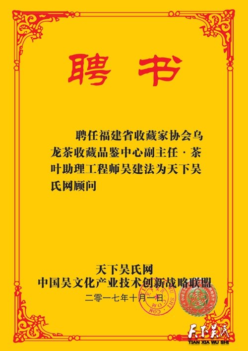 铁观音茶香悠悠,血脉宗亲情浓浓。2015年6月,在贵州省遵义市吴文化经济发展研究会成立大会上,吴建法所带去的安溪铁观音“国茶”更是与贵州茅台“国酒”携手芬芳全场。吴建法这种交流也发展到网络上。吴姓是中国人口数量最多的十大姓氏之一,全国有2460多万人,包括海外共有4000多万人。在吴建法看来,全国、乃至海外的吴氏宗亲是个更大的交流平台,他加入的全国吴氏宗亲的微信交流群就有80多个,还自建500人加入的世界吴氏宗亲交流群。在宗亲建议下,吴建法开始通过宗亲交流平台推广安溪铁观音。吴建法通过微信平台广邀天下吴氏宗亲来安溪品茗交流;在各地吴氏文化研究会、宗亲会上提供定制礼品茶,让参会宗亲人手一份安溪铁观音。4000多万人,一次宗亲交流会,如果每人喝一泡铁观音,那将是五十多万斤茶叶;推及全国百家姓,那数量更是可观。吴建法就是看准当前我国姓氏文化交流日益频繁这一契机,推广安溪铁观音。