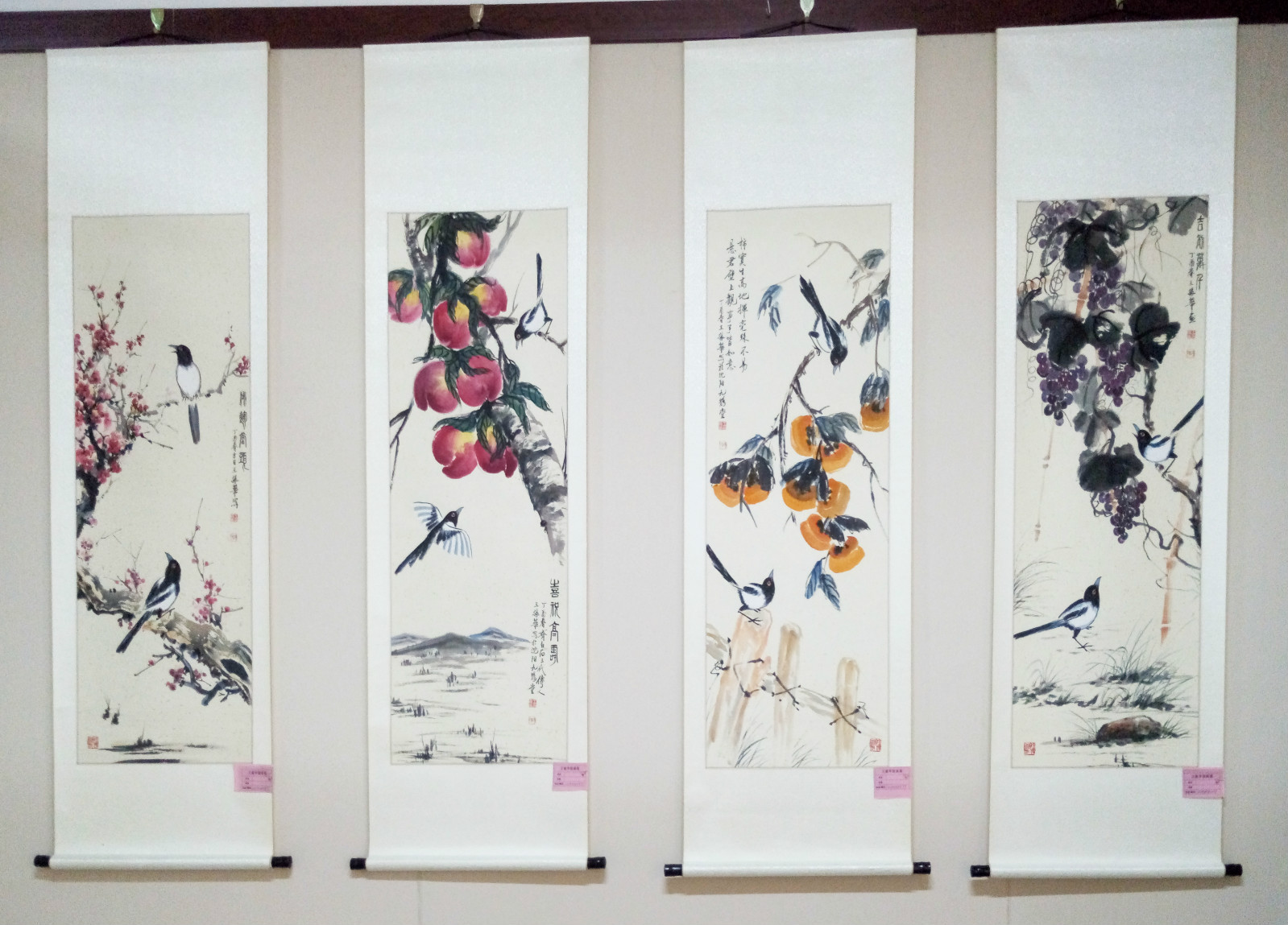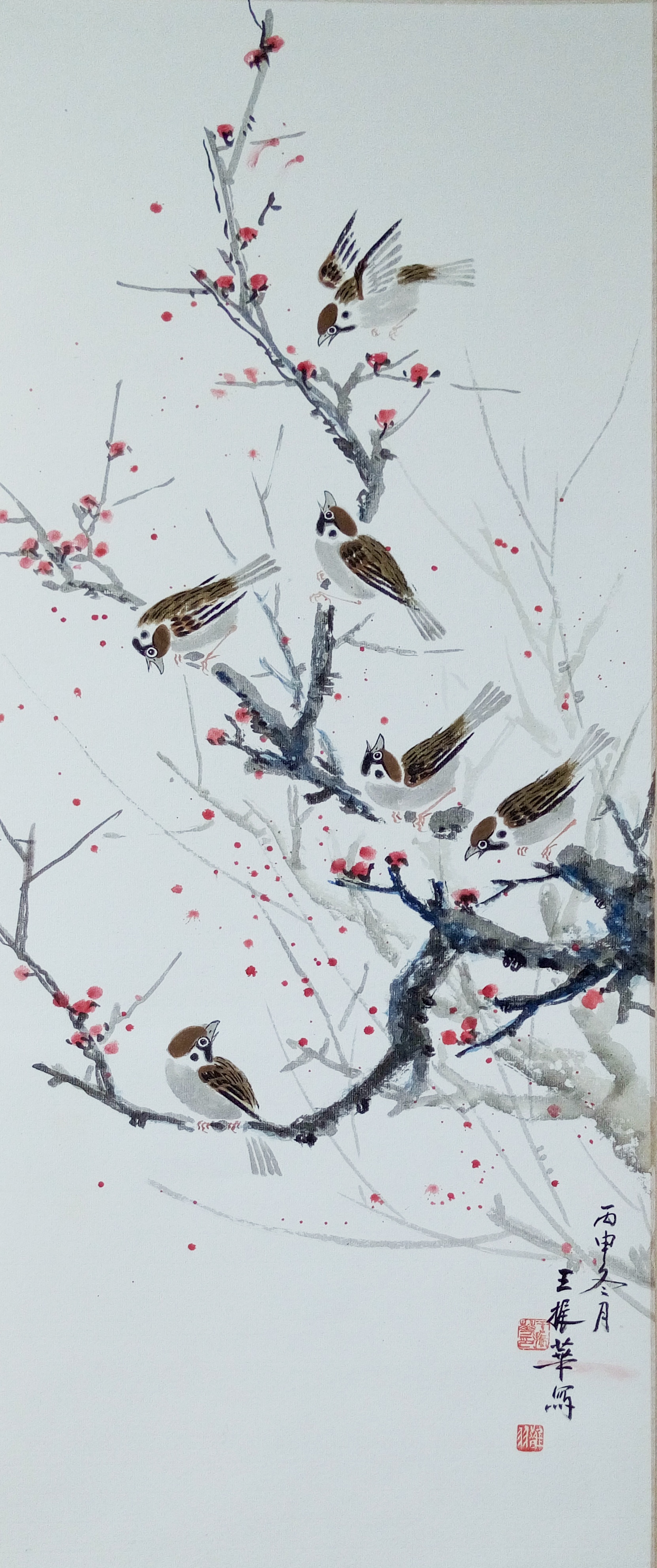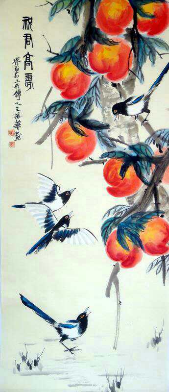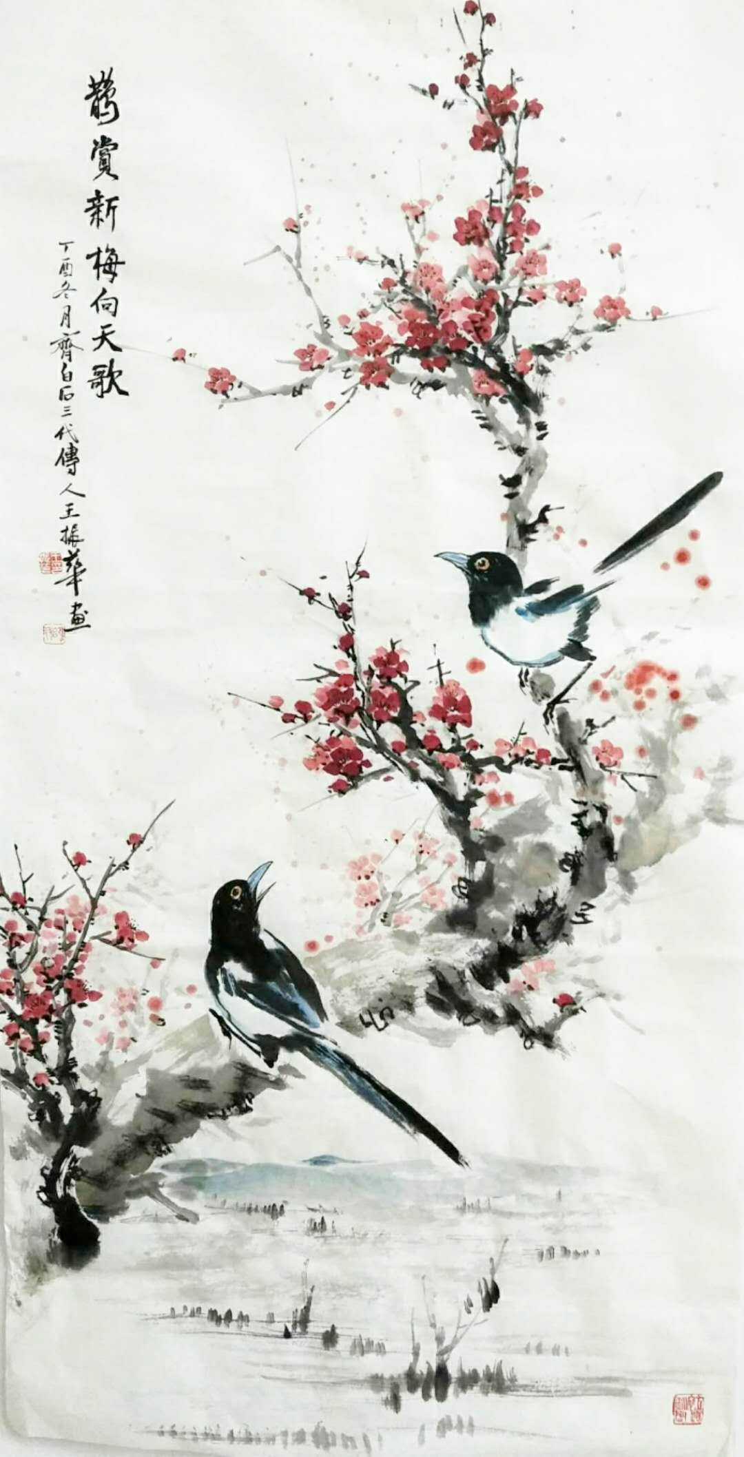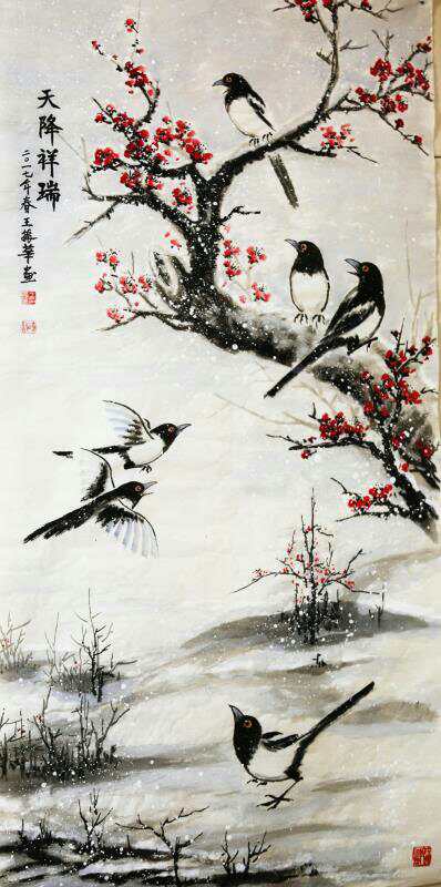 1993年的一天,也是振华先生艺术提升的机缘转折点,偶遇在学校当老师的我国著名绘画大师齐白石的第二代传人王长久先生,王振华感到机不可失,便挑选了十几副画作找到王老师请教拜师,王老师看完振华先生的作品后,赞不绝口,欣然将其纳为入室弟子。他在研习艺术的道路上,得王长久先生口传心授,精心点拨,使悟性极高的振华先生对齐白石大师的艺术真谛有了深刻领悟。为丰富艺术的多元化,又在王老师的建议下,振华先生又开始涉猎画喜鹊等题材。齐白石的:“学我者生,似我者死”名言。让振华先生有了新的思考,虽然成了齐白石第三代传人,更不想就此炫耀自己,他决心探索一条适合自己的艺术之路。记得,宋代大文豪欧阳修曾写过赞美喜鹊的诗句:“鲜鲜毛羽耀明辉,红粉墙头绿树林;日暖风轻言语软,应将喜报主人知。”喜鹊作为吉祥的象征,历来被人们所喜爱。振华先生以前也画过喜鹊,但在王老师的指点下,有了飞跃的进步,不过每次拜访老师都是不厌其烦的给他讲解让之感动!他认真学习细心揣摩,他凭借童年的印迹提笔表意,画作如同进入了苏轼的诗句那样:“牧童弄笛炊烟起,采女谣歌喜鹊鸣”的佳境。振华先生为了实现艺术家的抱负,将自己的画室改成“九鹊堂”。他意味深长地告诉王老师:“北京有荣宝斋,关东有九鹊堂。希望将来从九鹊堂中飞出的喜鹊为天下的人们报平安。”通过振华先生的不懈努力,“关东喜鹊王”的雅号早已在我国艺坛、藏界流传。从此,振华先生工作之余经常到郊外去观察喜鹊,可谓“爬冰卧雪”、“废寝忘食”,几个小时下来腰酸背麻,眼睛酸疼,但他不在乎这些,他注意观察喜鹊的千姿百态,用速写方式将其记录下来。由于细心观察和反复琢磨,所以日后他笔下的喜鹊总以粗笔湿墨,独具神色。清晨遥望碧蓝天空,当人们听到喜鹊清脆的叫声,更是喜上眉梢。喜鹊在民间就有被称之“喜鹊神”、“鹊桥”之美誉。