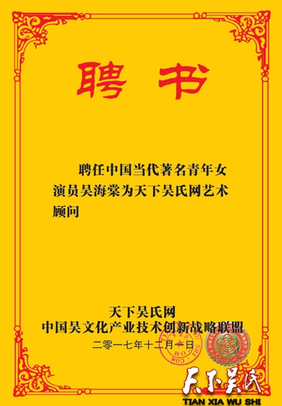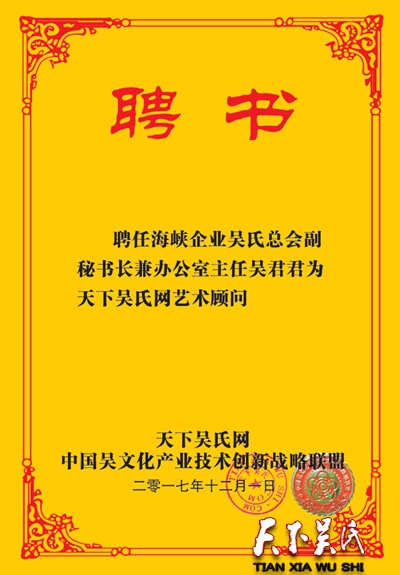 《天下吴氏》网在各位吴氏宗亲的鼎力支持下于2017年10月1日正式上线!现将部分顾问如下公示(新增顾问名单随时更新中……)排名不分先后,巾帼不让须眉,很有典范的10位多才多艺的吴家美女加入!锦上添花!欢迎更多的吴氏宗亲加入到天下吴氏网这个大家庭,为传承吴文化,弘扬至德精神奉献自己的一份光和热!
