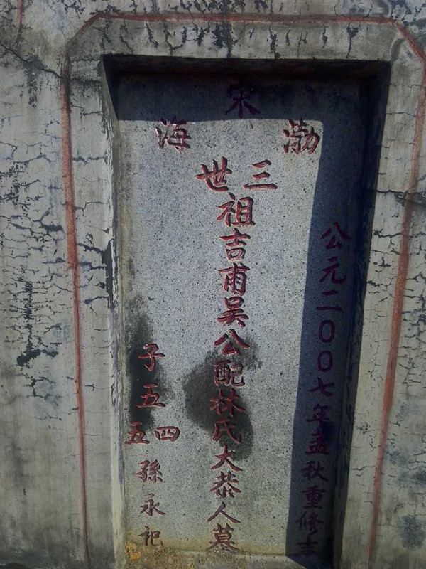 谱记,吉甫公(泰伯72世),又名远谟,坤二公之三子,世居福建省汀州府永定县群萃州,宋进士,原任广东博罗县知县,忠信廉明,邑人戴德,名载邑志。生於宋神宗元丰五年(1082)壬戌正月二十日,卒於宋孝宗隆兴元年(1163)癸未,享寿八十有二岁。配林氏传派福建永定、晋江县灵水、广东大埔等处。公葬福建永定县扶来圩丰田里湖雷乡莲塘岗锈针落槽形庚山甲向,妣林氏福娘,卒于南宋孝宗乾道七年(1171年)辛卯,葬大埔县与永定县相连地界断缺背,又曰沟沙坪村中逆水吸水龟形,戌山辰向。丰顺汤田刊谱载长治地方蓝树校向狗社坪,戌山辰向。乾隆25年(1760年)润五月初四日午时,重修分金,九大房永远昌盛,惟坟左地坪被邹姓建筑围墙,有碍观瞻,次年邀请各户题银,向邹姓买拆围墙地基数丈,即立界无异,裔孙见龙买墓前围地数丈。生子二:长五四郎,次五五郎裔传福建省漳州天宝市。