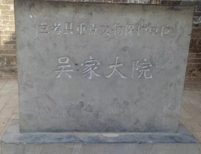 吴家大院简介:吴家大院位于兰考县仪封乡中老君营村,始建于清末,原规模分东、中、西三院,占地3000余平方米。现仅存东院,保存基本完好。该院为四合式院落,东、西长23.36米,南、北长24.18米,占地560余平方米,中轴对称布局,自南向北依次有院门、门廊、东西配房及主楼。院门所处为院落南墙,墙体厚实、高大,高约5.5米,厚0.83米,顶砌垛墙,坚固异常,防御意味浓厚,望之森严。门楣上砖雕“重门燕喜”。门廊为五架悬山式建筑,面阔三面,进深一间。东西配房均为五架梁硬山式建筑,两层,面阔五间,进深一间,未设立柱,梁架直接承于墙体。建筑一层墙体为青砖,二层墙体为土坯外包青砖(俗称里生外熟)。主楼为一座二层平顶式建筑,面阔三间,进深一间,未设柱,梁架直接承于墙体,墙体厚约0.95米。楼顶设女儿墙及垛墙体,四角耸起砖砌尖角,状似皇冠,形制独特。院内建筑均有高大台基,尤其正方台基高约2米。建筑台阶均非传统住宅中的踏步形式,而是便于车辆通行的礓碴。整座院落建筑由南向北依次升高,主次分明,砖雕装饰精美,建筑外观高大宏阔,牢固森严,为清代民居中的罕见实例。2004年9月县政府公布为第三批重点文物保护单位。2016年1月公布为河南省重点文物保护单位。