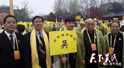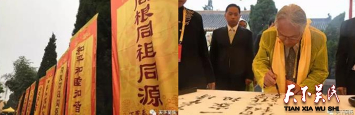 天下吴氏讯(特约采编 吴国发)2017年3月30日(农历丁酉年三月初三),黄帝故里拜祖大典在河南郑州举行,来自世界各地的40多个国家和地区的近万名海内外华人代表纷纷前来参与拜祖大典,场面空前盛大,前所未有!各地的吴氏宗亲也有在被邀请之列,齐聚郑州,虽然下着雨,也冒雨参加黄帝故里拜祖大典,共谋百年大计,十分感动!两岸和平发展论坛召集人、劳动党主席、台湾百姓文化交流协会理事长吴荣元入场题字,在祈福树挂上了祈福牌。
