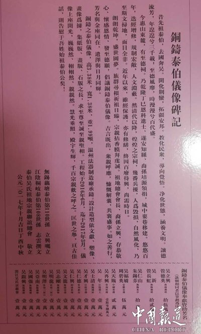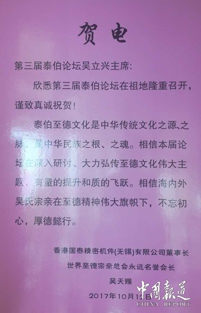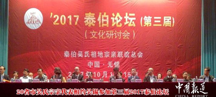 2017年10月12日—15日在这大好的日子里,华夏生肖博物馆、至德世系姓氏文化园揭牌“梅村——岐山”寻根之旅线路开通仪式,以及泰伯论坛交流盛会。在吴氏祖地无锡梅村隆重举行,来自海内外、港澳台、全国各地的专家学者欢聚一堂,探讨至德文化。这次泰伯论坛由泰伯吴氏祖地宗亲联谊总会主办。论坛主题:泰伯至德文化与中华传统文化。至德文化是充满活力的中华传统文化。至德文化源头深远,它是一门古老的中华文化,是对三千二百多年的中华德文化的传承和发扬光大,与当今社会和平发展理念一脉相承,具有强大的生命力,需要继续提倡。人类文明起源于最先是道德文明。近年来,全国各地民间往来、文化交流、经贸合作日益密切。通过论坛平台,把宗亲文化、吴文化、至德文化等中华传统文化在海内外、港澳台、全国各地宗亲的心目中发扬光大。心心相印,心心相连,通过交流论坛互勉互励,共同为中华民族伟大复兴做出贡献。