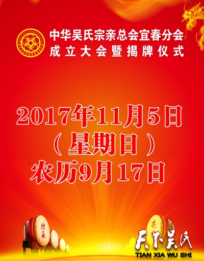 天下吴氏讯(特约采编 吴蜀丰 吴程)2017年11月5号上午9点整(星期日)农历9月17日中华吴氏宗亲总会宜春分会(宜春氏三阳吴氏祠堂)揭牌仪式谨邀您参加!期待你的光临指导!参会报名联系人 吴江 18007958768