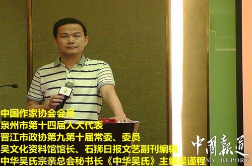 中国报道讯 吴谨程,笔名梦蝶。作品散见于《诗刊》、《文艺报》、《诗选刊》、《星星》、《诗歌月刊》、《福建文学》、《北京文学》、《黄河诗报》等报刊,多次在全国、省市征文比赛中获奖,入选20多种文集。系中国诗歌学会会员,福建省作家协会会员,福建省民俗学会会员,福建省艺术摄影协会会员,泉州市作家协会副秘书长,晋江市蓝鲸诗社社长,政协晋江市第九、第十届常委、委员。著有诗集四部、散文集一部。