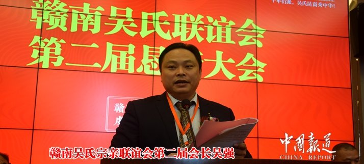 新当选的赣南吴氏宗亲联谊会第二届会长吴强在就职典礼上表示,新一届赣南吴氏宗亲联谊会将不忘初心,以传承吴文化为己任,弘扬至德精神为宗旨,继续认真开展相关工作。