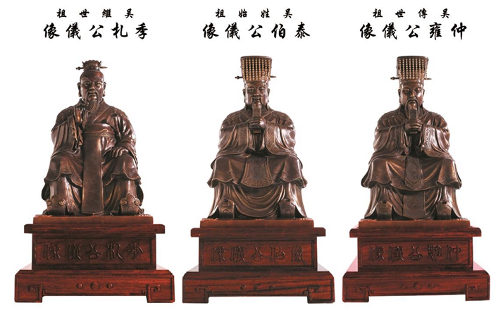 紧接着吴雷就为什么要统一“三公”像,以及“三公”标准像的设计理念问题,代表我们监制单位、“三公”像设计团队和敬铸单位简要汇报 :为什么要统一“三公”像?早在 1300 年前唐朝画圣吴道子,曾经为始祖吴泰伯和孔子画过像,目前全世界使用一张面孔的孔子像就是画圣吴道子所画的“先师孔子行教像”,而画圣吴道子所绘始祖吴泰伯像却未统一,其形象各异,千姿百态,面目不一。供奉和张挂于宗庙、祠堂之上,绘制在族谱之内的始祖像被后世随意刻画,一个始祖多张面孔,这是对祖宗的极大不敬,难怪有些宗亲在议论,为什么现在吴家出现不协调、不团结的问题这么多呢?究其原因是与所供奉的得姓始祖泰伯、传代始祖仲雍、继祖季札“三公”像形态各异、相貌不一有关。到底哪一位是我们的始祖呢?现将其画像分别展示如下。
