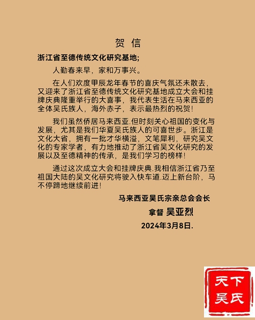 马来西亚吴氏宗亲总会致浙吴总会贺信