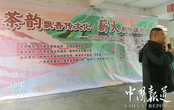 中国报道讯(吴蜀丰报道)茶韵飘香传文化,薪火相传满校园。由广西万秀区统战部、万秀区教育局主办,梧州市文化路小学承办,梧州市农业科学研究所、梧万秀区城北街道办、梧州市万秀区工商联、梧州市万秀区科技文化体育旅游局、广西岭南泰伯六堡茶业有限公司党支部、梧州市竹茗茶业有限公司协办的茶文化节3月11日在梧州市文化路小学举办。