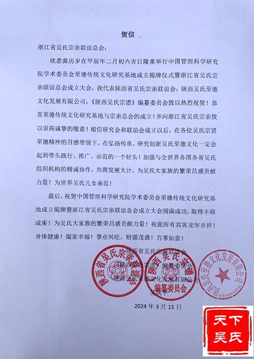 陕西省吴氏宗亲联谊会致浙吴总会贺信