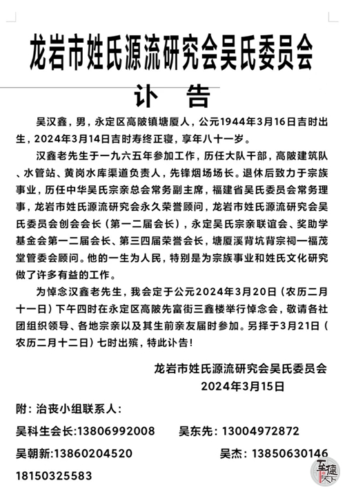 惊闻中华吴氏宗亲会常务副主席吴汉鑫先生于2024年3月17日因病逝世!广东珠三角吴氏宗亲会表示沉痛哀悼!并向吴汉鑫宗贤家属致以亲切的慰问!望节哀顺变!吴汉鑫宗长的一生,是传承吴氏至德精神的一生,是弘扬始祖三让高风的一生,他为中华吴氏宗亲总会和龙岩市姓氏吴氏委员会、永定吴氏宗亲联谊会吴文化传播与吴氏宗亲工作作出了很大的贡献。他的至德精神长存,永远活在吴氏宗亲心中!