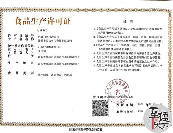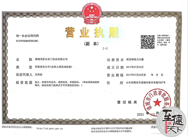 天下吴氏网讯(吴蜀丰吴乾山吴建东吴启林报道)匠出名门食品有限公司成立于2018年3月3日,坐落于物产丰富、人杰地灵、历史悠久的诸城,诸城又称“龙城”,享有“中国美食制造之都”的称誉!