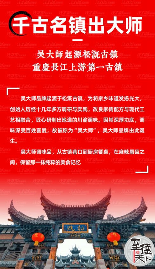 天下吴氏网讯(吴蜀丰吴乾山吴建东吴启林报道)吴大师品牌故事 名镇出大师,大师源自重庆长江上游第一古镇 重庆人对火锅的记忆,续存于百年间,孕育于古镇巷。滚滚长江奔流,市井码头兴起,催生了松溉古镇火锅文化的发展。而在这座长江上游“第一古镇”之中,吴大师就此萌芽。