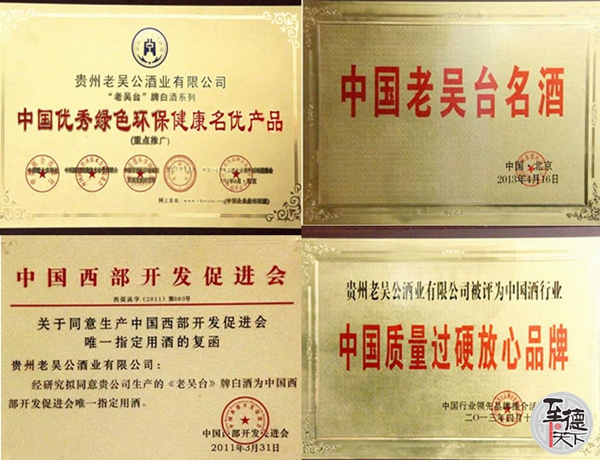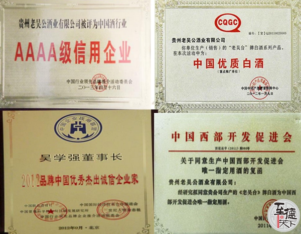 后来,茅台村的人们为了怀念这位“仙女”,特意在瓶颈上系两条红绸带子,以象征仙女披在肩上的那两条红飘带。这就是茅台地区出产的美酒产品包装的最早雏形,也是最经典的包装标识。沧海桑田,转眼过去了很多年,当年的吴公老两口的后人已经遍布赤水河流域,他的子孙后代在全国和世界各地从事着各种行业,但无论怎样,他们忘不了家乡的美酒,于是,部分吴公后人再度传承祖业,酿酒手艺传承从未中断;随着历史的变迁,社会的发展,科技的进步,伴随着茅台镇千年古法酿酒技艺的日臻完善,如今,吴公后人-清华学子学强,通过不懈努力,将传统酿酒事业与国学文化精髓有机融合,另辟蹊径,赋予了美酒佳酿前所未有的生命力;经中华人民共和国国家工商行政管理总局商标局核准,吴氏美酒产品正式注册命名为----“老吴台”合法商标,吴氏美酒再次焕发出创新的活力,绽放出强劲有力的时代光彩!