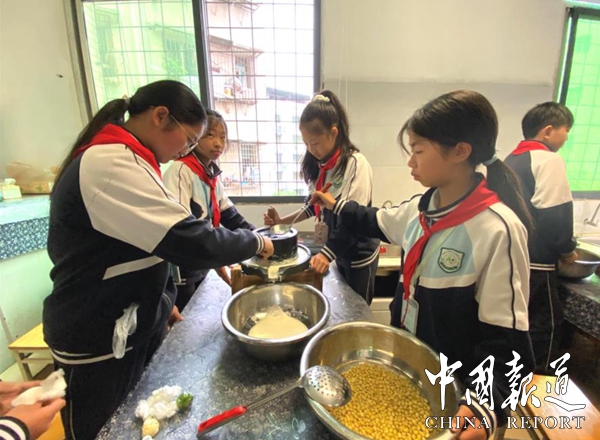 “学校设置‘木洞豆花’实践课,把国家级非物质文化遗产‘木洞山歌’引入课堂,既能把劳动教育融入学生的个人成长中,又能让学生了解和传承中华优秀传统文化,最终实现增强学生文化自信的目的。”木洞中心小学相关负责人表示。