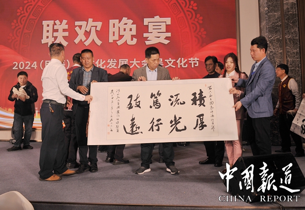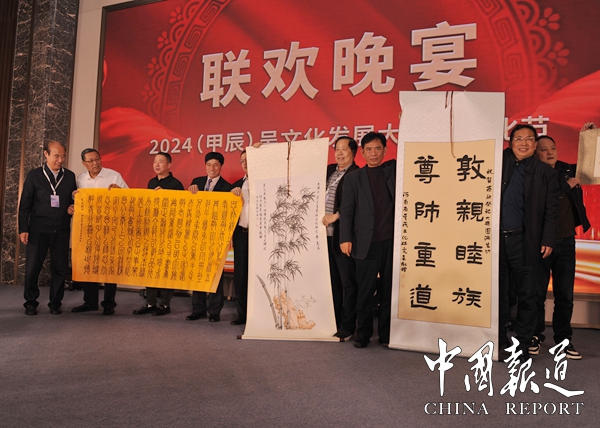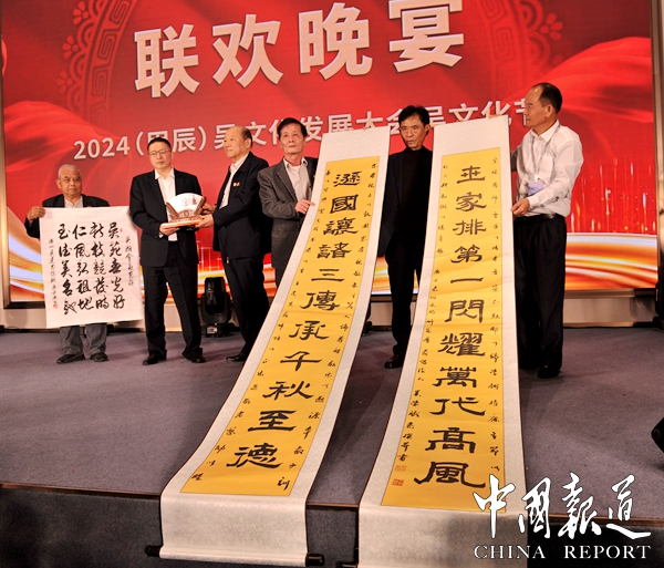欢迎晚宴上还举行丰富多彩的文艺节目表演,各地代表团向祖地赠书法墨宝,无锡市新吴区泰伯文化研究会还回赠原创歌曲《至德流芳》竹简留存纪念。