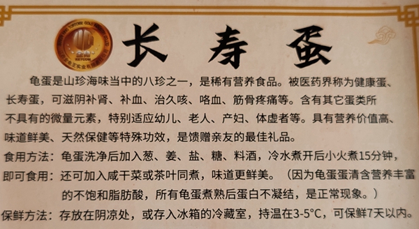 龟蛋是稀有的营养食品。 被医药界称为健康蛋、长寿蛋,可滋阴补肾、补血、治久咳、咯血、筋骨疼痛等,含有其它蛋类所不具有的微量元素,特别适应幼儿、老人、 产妇、体虚者等。具有营养价值高、味道鲜美、天然保健等特殊功效,是馈赠亲友的最佳礼品。