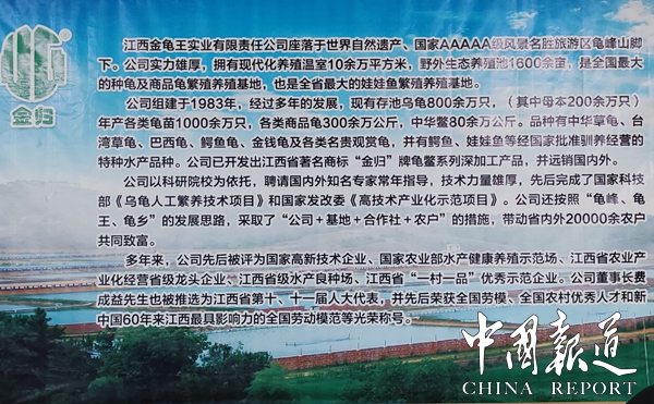 公司在发展过程中常年与国内大专院校和科研机构交流合作,先后完成了国家科技部《乌龟人工繁养技术》、《娃娃鱼工厂化人工繁育养殖技术集成与示范》和国家发改委《中华草龟良种快速繁育高技术产业化示范基地》等项目。依靠科技求发展,为不断满意市场需求,公司又开发出深受用户好评的江西省著名商标“金归”牌龟鳖熟食系列产品。公司按照“龟峰、龟王、龟乡”的发展思路,制定“公司+基地+合作社+农户”的措施,辐射带动省内外2万多农户从事龟鳖养殖,农民增收数十亿元。