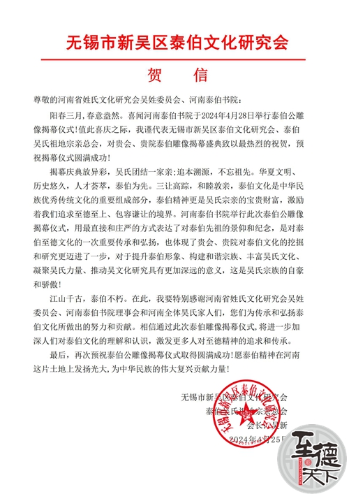 无锡市新吴区泰伯文化研究会河南省吴姓委员会贺信
