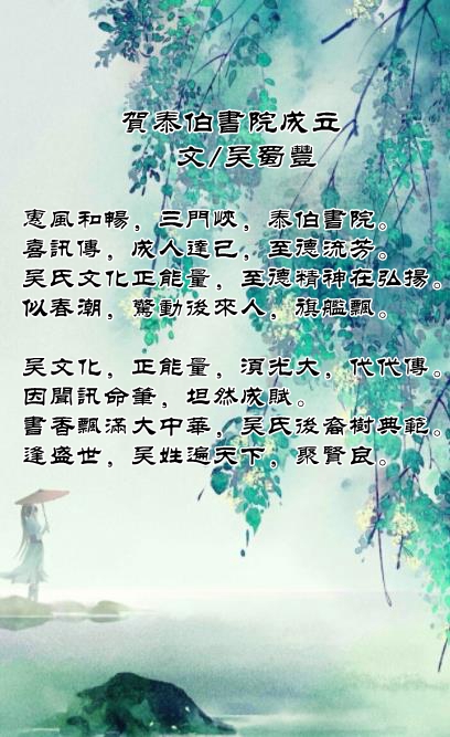 惠风和畅,三门峡,泰伯书院。喜讯传,成人达己,至德流芳。吴氏文化正能量,至德精神在弘扬。似春潮,惊动后来人,旗舰飘。吴文化,正能量,须光大,代代传。因闻讯命笔,坦然成赋。书香飘满大中华,吴氏后裔树典范。逢盛世,吴姓遍天下,聚贤良。
