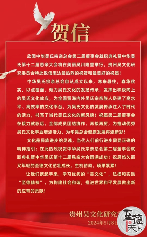 中华吴氏,人兴家旺,吴氏文化,源远流长吴氏族人不忘先祖高德,弘扬中华优秀传统文化,恳亲互动;联谊宗情,与时俱进,着力打造吴氏文化品牌高度,造福乡里,泽佑子孙,贵州吴氏为此送上最诚挚的问候和最美好的祝愿!并希望同全国各地的吴氏兄弟姐妹、文化团体、经贸企业,在弘扬传承优秀吴氏文化事业的道路上能携手前行,在发展吴氏经济产业中共同奋进、共同受益。