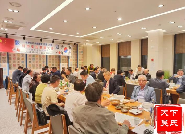休息片刻,便乘坐大巴车至“韩彩堂”参加为恳亲团一行举办的欢迎晚宴。晚宴上,恳亲团一行得到了韩国吴氏宗亲总会会长吴永泽,监事吴寿南、吴英豪,事务长吴决周、吴时昌,副会长吴昊铉、吴富泳、吴景锡、吴锡奎、吴白宁、吴兴培、吴寿康、吴锡甫、吴玉姬、吴范燮,理事吴东奂、吴育焕、吴承勋、吴东锡、吴广秀等20多位宗亲,以及翻译李贵男、金美兰的热烈欢迎与盛情接待。