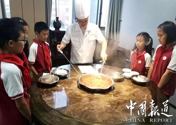 在杨宗红的带领下,40余名“小厨师”也学起了火锅汤底的熬制,体验了一把“将一口空锅,变成一顿热热闹闹、红红火火的重庆火锅”。最让孩子们感兴趣的是火锅试吃环节。在体验完火锅底料的制作流程后,孩子们早已垂涎欲滴。此时,两盆翻滚的火锅汤底热气升腾,芳香四溢,早已抵挡不住诱惑的孩子们变身美食“品鉴官”,一边品尝着美味,一边感受着厨师们劳动的艰辛。