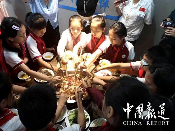 “吃过很多次火锅,但并不知道怎么做,这是我第一次体验选料、炒料,学习怎么做火锅,感受非遗魅力,过了一个非常开心的‘六一’儿童节。”四年级(二)班学生陈妍一边开心地吃着火锅,一边开心地说。