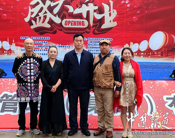 六盘水市委统战部副部长、六盘水市工商联业联合会组书记唐小国,六盘水山东商会李秋宝秘书长,六盘水钟山区电子商务协会会长周靖轩,六盘水中老年文体艺术协会会长齐运超,六盘水中老年文体艺术协会指导员李勇耀,苗三月总经理刘锦霏,苗三月商学院院长李儒军,北京石齐画院副院长刘军才,老吴台集团董事局主席、贵州省吴文化研究委员会主席、老吴台酒业集团董事长吴学强,中国外文局亚太传播中心(人民中国杂志社中国报道杂志社)中国报道《魅力城乡》主编吴蜀丰,俄罗斯联邦传统东方医学专家学会黄国荣会长,九代中医传承人,鬼门十三针第十代传人,贵州康有度中医馆连锁品牌创始人吴峰攀,国培在线项目管理办公室主任中国智慧工程研究会能力建设与继续教育工作委员会理事长李传华等有关负责人应遨参加剪彩仪式。