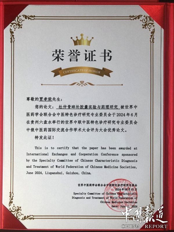大会期间,专家们就中医药在疾病预防、治疗、康复中的独特优势进行了深入探讨与交流,以期共同促进中医药在国际上的发展。其中,福州问美生物科技有限责任公司(以下简称“问美生物”)贾孝荣教授作为问康堂杜仲骨碎补胶囊首席研发专家受邀参加了此次盛会并发表学术演讲。由兰州青黛健康养生研究院向大会撰写提交的学术论文《杜仲骨碎补胶囊实验与药理研究》,以创新的研究和独到的见解,赢得了与会专家的高度评价,并荣获“优秀论文奖”,入编大会论文集选。