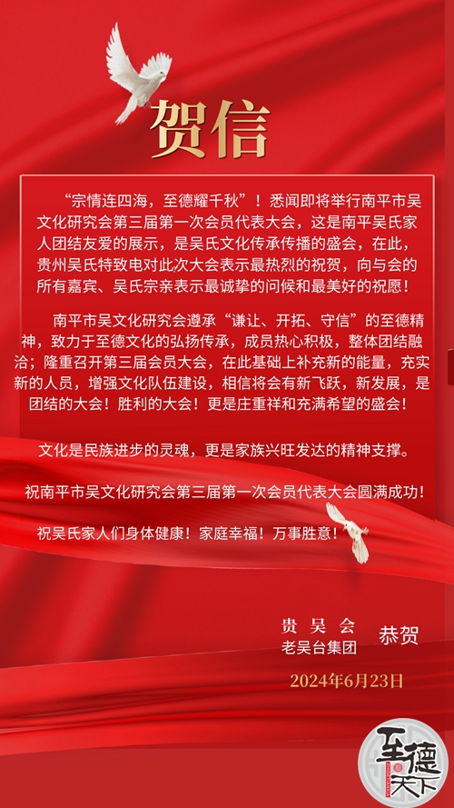 贵吴总会老吴台集团致南平市吴文化研究会贺信