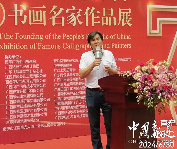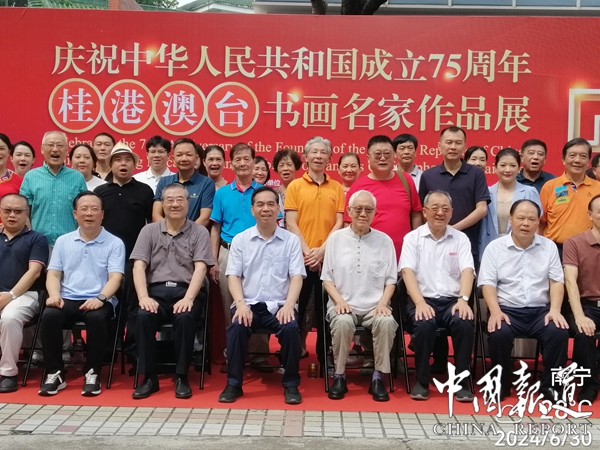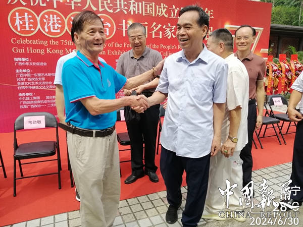 中国报道讯(吴蜀丰报道)6 月 30 日,广西南宁书画院洋溢着浓厚的喜庆氛围,一场隆重的书法展览活动在此盛大举行,以纪念建国 75 周年。此次活动意义非凡,广西岭南泰伯六堡茶业有限公司党支部,及广西吴氏经济文化发展联谊会第三届会长吴茂柏受邀参加这次活动。在活动中与广西壮族自治区原政协副主席黄道伟亲切交谈文化艺术的传承。随后和老领导及港澳台书法家们一起参观了有关作品。
