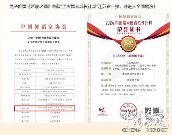 中国报道讯(吴蜀丰 通讯员牟孙涛)日前,由江阴市公共文化艺术发展中心、江苏省江阴中等专业学校、江阴市祝塘镇教育文体科共同创排、江阴市音乐舞蹈家协会选送的男子群舞《延陵之狮》获“顶尖舞者成长计划”江苏省十强并进入全国展演。