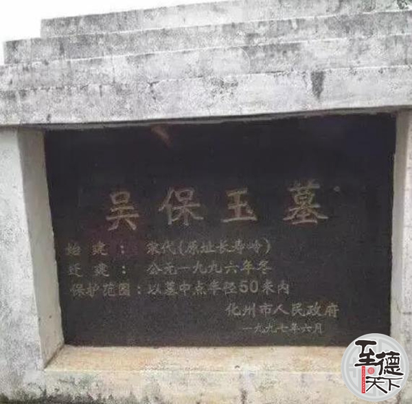 吴保玉是吴泰伯的76代孙,和吴保金、吴保琛兄弟三人同是宋进士,是吴氏入粤始祖之一。吴保玉公墓原位于化州市区长寿山上,由于长寿山属国家级保护文物,因需要开发建设,由政府出资20多万元和吴氏宗亲捐资迁葬于现公园内,这里风景秀美,规划合理,是一个观光、旅游、学习的好景点。
