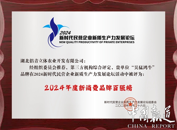 中国商业经济学会标准化工作委员会为我司颁发《民族品牌》证书新时代民营企业新质生产力发展论坛组委会为湖北倡青立体农业开发有限公司颁发《荣誉证书》及《荣誉牌》,吴猛鸿牛董事长颁发顾问颁发《荣誉证书》。湖北倡青立体农业开发有限公司与梅县区人民政府签订吴猛鸿牛100亿罐的生产基地投资框架协议与南水北调元宇宙研究中心签订战略合作协议,与景德镇国家陶瓷版权交易中心签订战略合作协议。发布会当天还将签订全国各片区代理商协议,签订美国总经销协议,签订俄罗斯总经销协议。