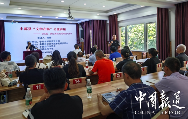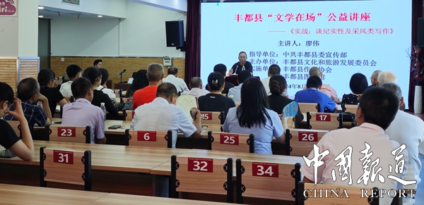 中国报道讯(通讯员代雨门)8月24日,重报集团都市报党委委员、编委,重庆晨报副总编辑,重庆市新闻媒体作协副主席廖伟应丰都县作家协会邀请,到丰都县图书馆举办 “文学在场”公益讲座。丰都县作家协会全体在丰会员、石柱县作家协会部分会员、丰都县图书馆部分工作人员共计40余人参加了讲座。