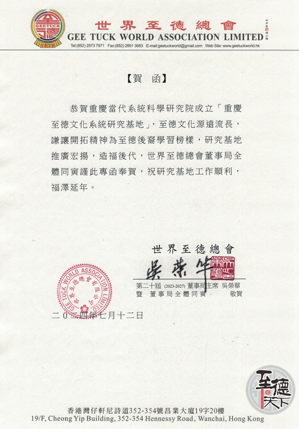 世界至徳总会致重庆至德文化系统研究基地贺电