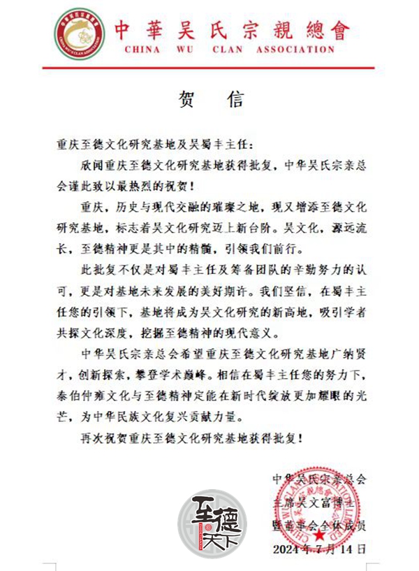 中华吴氏宗亲总会致重庆至德文化研究基地贺电