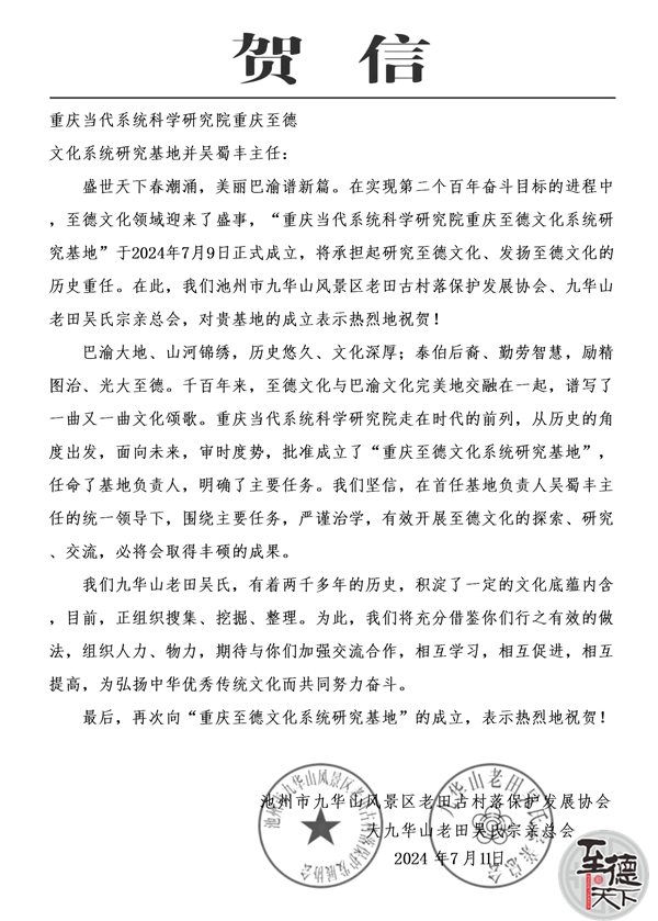 池州九华山风景区老田古村落保护发展协会致重庆至德文化系统研究基地贺电