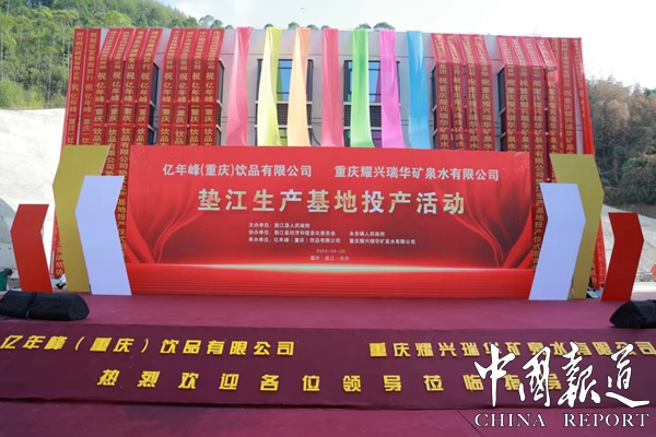 中国报道讯(吴蜀丰报道)9月20日,产值近4亿元的亿年峰矿泉水“重庆耀兴瑞华矿泉水有限公司”在重庆垫江永安镇石口子村红家沟(重庆耀兴瑞华矿泉水有限公司厂区广场)生产基地正式投产,为垫江产业高质量发展注入新动能。