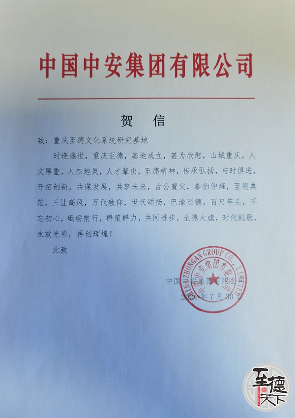 中国中安集团有限公司致重庆至德文化研究基地贺词